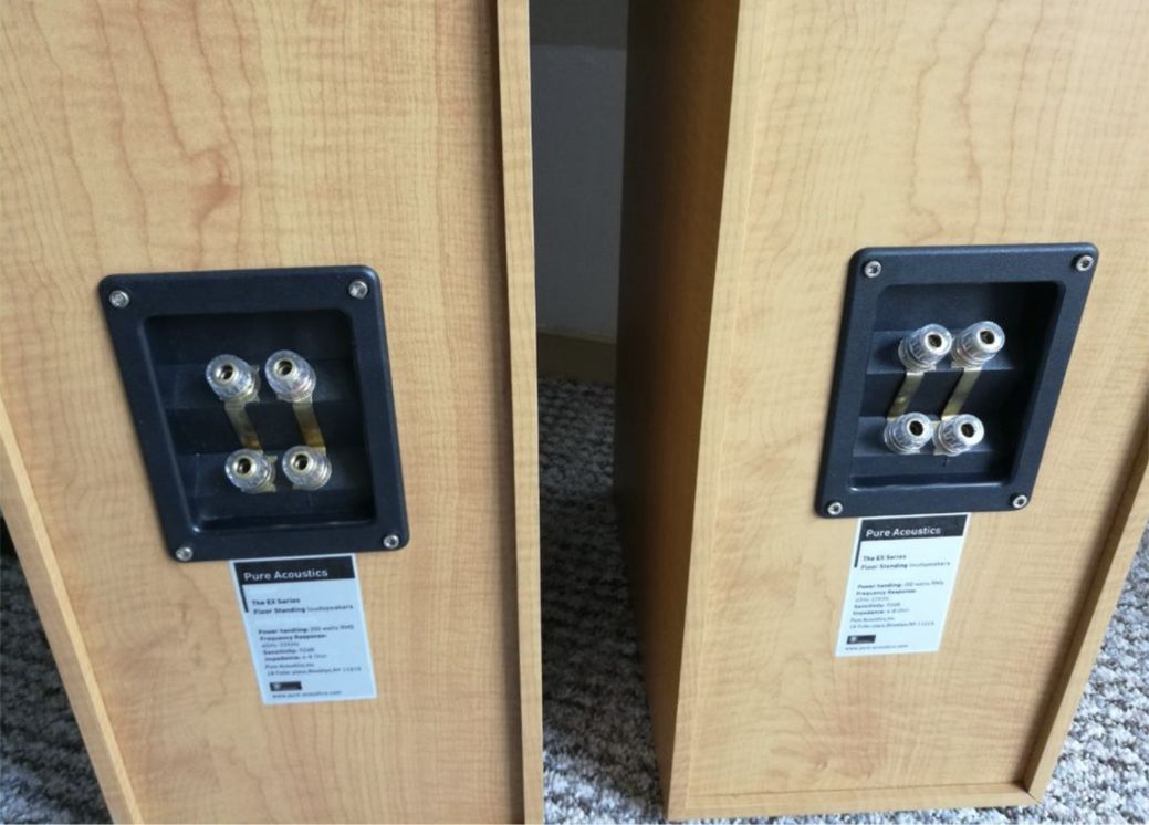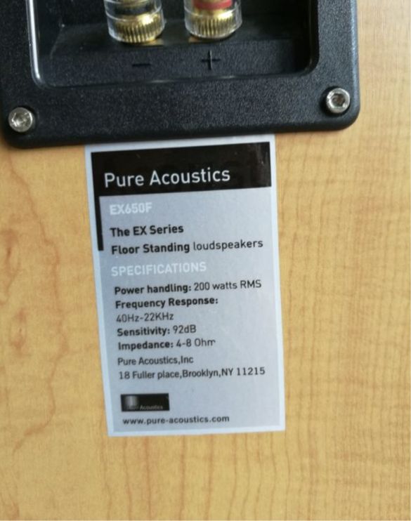 Sloupové reprobedny zn.Pure Acoustics, model EX 650 F, výkon 200W RMS, frekvenční rozsah 40 - 22 000 Hz, citlivost 92dB, impedance 4 - 8 Ohm, výška 101 cm, šířka 20 cm, hloubka 32,5 cm, pěkné a zachovalé reprobedny s velmi dobrým zvukem