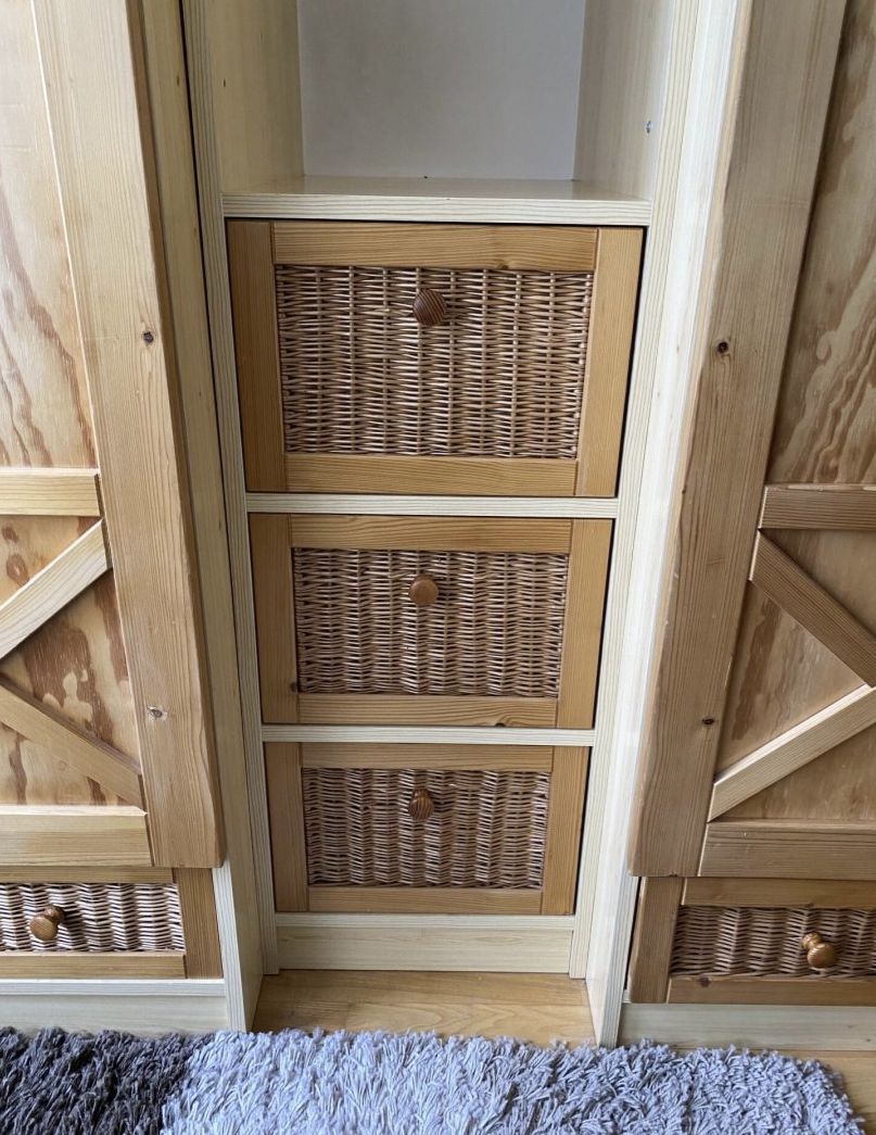 The bedroom furniture shown in the pictures is for sale. The front of the furniture is made of pine wood, the rest of the furniture board. The cabinet line is made up of separate elements.