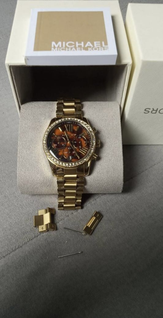 Michael Kors Mmlexingto/GOLD MK-7276 watch for sale. We bought the watch at the Budapest Arena in August 2023, there is an invoice. The dial is flawless, there are a few small, light scratches on the back and the strap, but none of them are noticeable overall. The expanders are included in the box.