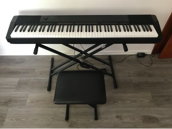 CASIO CDP-130-BK electric piano for sale with accessories: music stand, headphones, stand and chair. The pedal and charging cable are a matter of course.