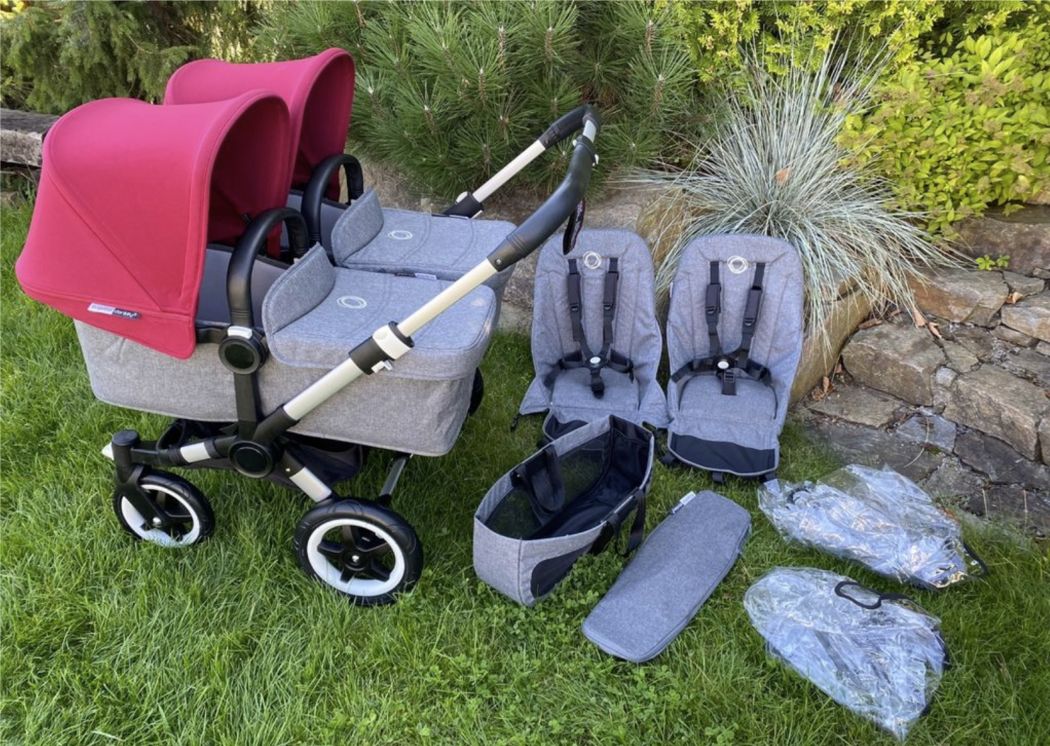 For sale, a really top Bugaboo stroller for the Donkey siblings. It is in the most comprehensive version for twins. The stroller is in top condition, the colors are saturated, no fading anywhere, not even on the bottom basket. It was used minimally, that's why it's in such a beautiful condition. The only signs of use are on the handles. These can be replaced or covers can be purchased, but this is a cosmetic defect. The stroller can be used for twins, siblings or one child. Both the body and the seats can be clipped against or behind the direction of travel. If you are interested, you can also buy fusaks ruby ​​red or gray melange - all in top condition, price 1450 per piece, summer canopies 780 pcs. I have them in other ads. The stroller is compact, easy to use, has an adjustable handle, wheel lock, brake, 3 seat positions and more. A big advantage is that the stroller can pass through a classic 80 cm door, even in the version for twins.