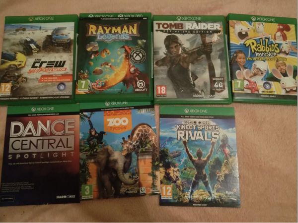 I am selling an xbox one with a kinect, a 2-wheel steering wheel and 7 games together