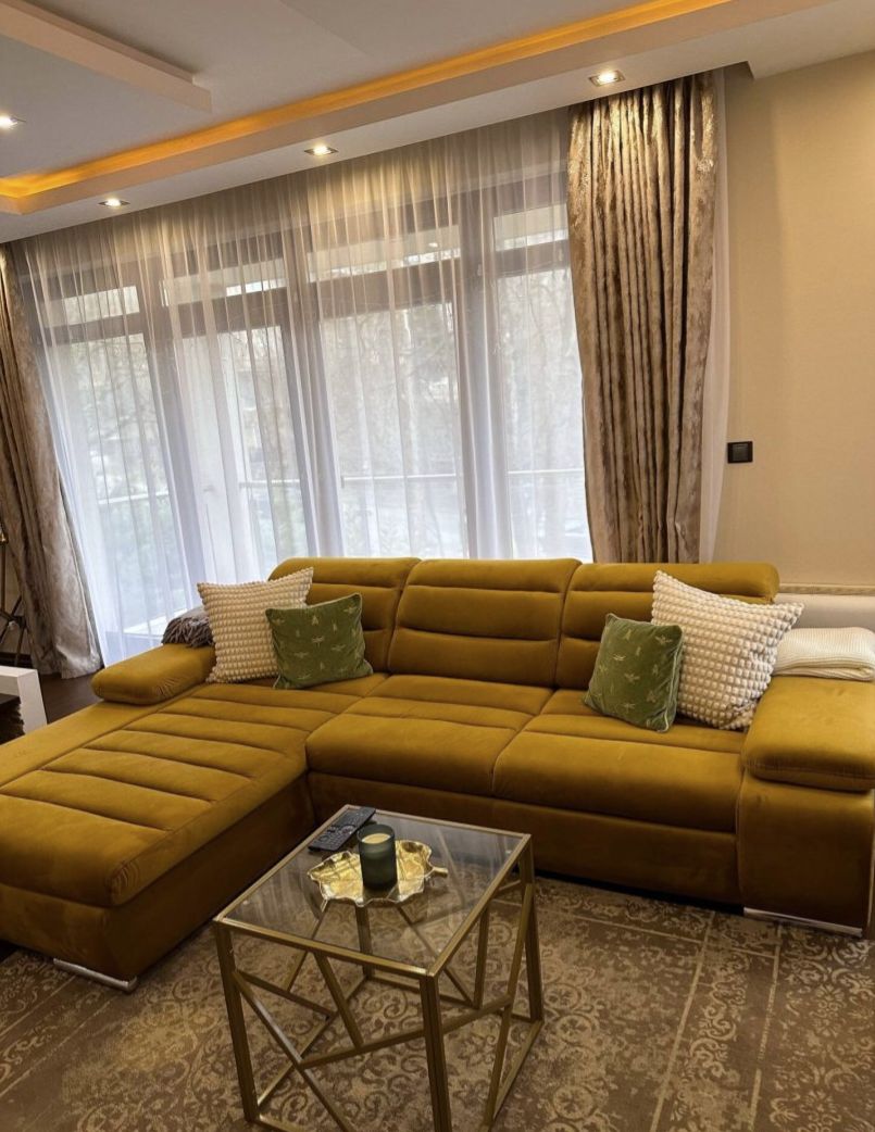 For sale: a very nice, almost new, velvet sofa, easy to clean, with a corner on the right side, can be used as a bed, bed linen holder, adjustable headrest.