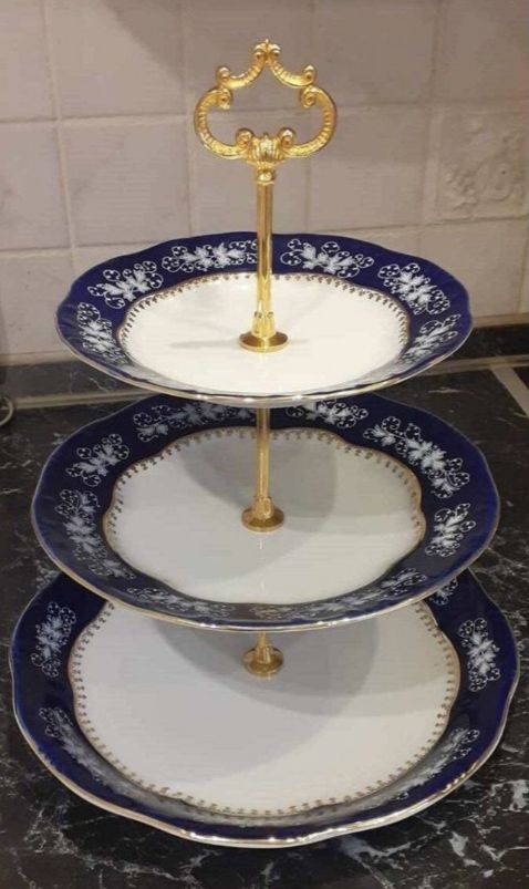 Zsolnay Pompadour három emeletes mintás, kék, süteményes porcelán kínáló tál eladó.