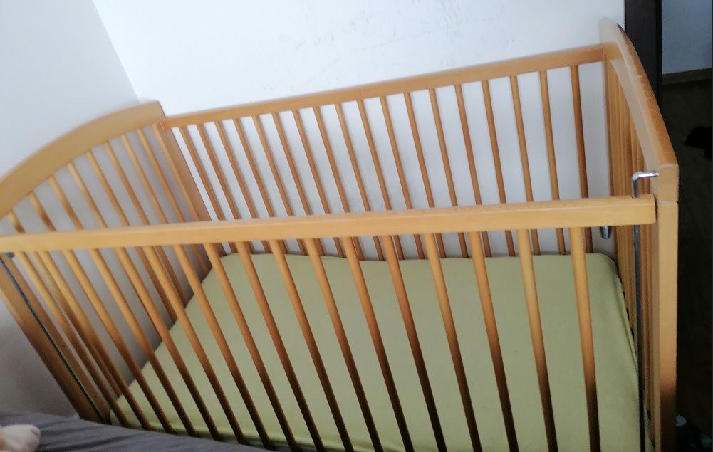 I am selling a baby cot, adjustable to 3 levels. The handle (one side of the crib) can be lowered and thus moved closer to the bed. Wheels.