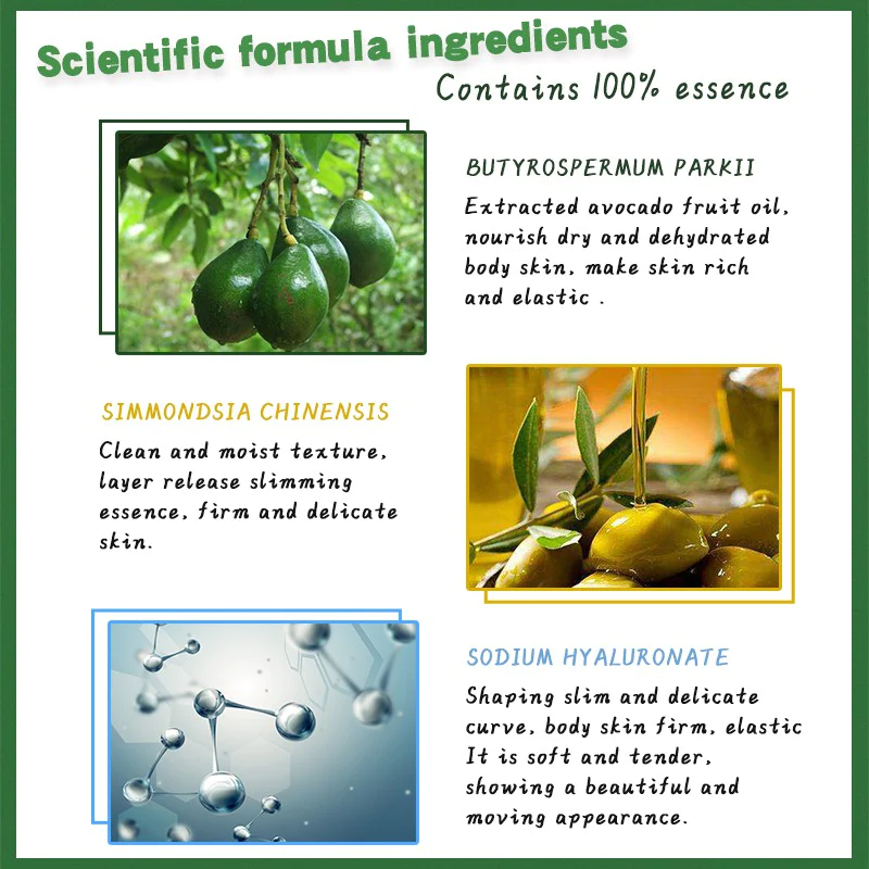 Features: Extracted avocado fruit oil, nourish dry and dehydrated body skin, make skin rich and elastic; clean and moist texture, layer release slimming essence, firm and delicate skin, shaping slim and delicate curve, body skin firm, elastic It is soft and tender, showing a beautiful and moving appearance.