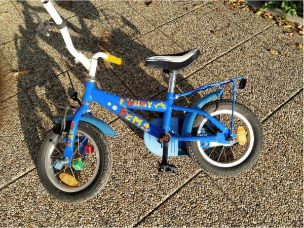 Detský bicykel DEMA Funny 12″, s pomocnými kolieskami,košíkom a svietiacimi kockami na prednom kolese. Nutné vymeniť rukovate. Hmotnosť cca 8,1kg.Cena: 35.- €.